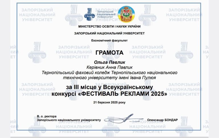 Фестиваль реклами 2025 та грамота за 3 місце – такими досягненнями може похизуватись наша студентка 1 курсу!!! Пишаємось нашою Olha Pavlyk та бажаємо не зупинятись – щеі ще нових здобутків та перемог! Дякуємо керівнику Анна Павлик за підготовку!